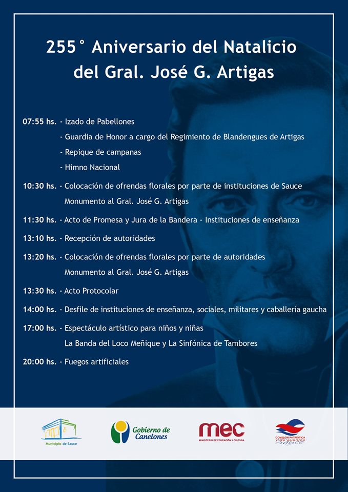 Lamentablemente por causa mayoritariamente de las inclemencias del tiempo se vieron suspendidas algunas de las actividades programadas dentro de los festejos por el natalicio de Artigas. Por tal motivo estamos comunicando las que nos van notificando y ni bien queden reprogramadas publicaremos las actualizaciones. Lamentablemente los pronósticos para este sábado 15 y domingo 16 de Junio de 2019 no son muy esperanzadores. Actualizaremos.