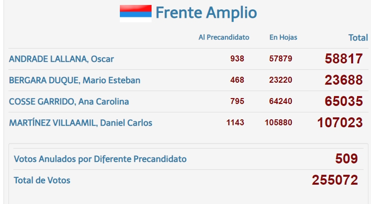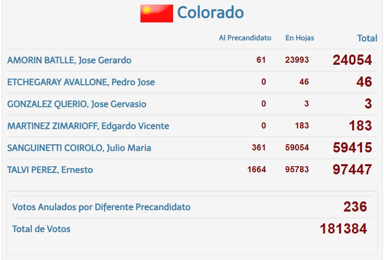 También había mucha expectativa por la votación de Juan Sartori, si bien le alcanzo para posicionarse como el segundo candidato mas votado dentro de la interna del Partido Nacional el numero real y definitivo parece haber sorprendido a los mas entusiastas de sus adeptos que llegaron a imaginar que podía pelear el primer lugar de la interna a Luis Lacalle. Un Juan Sartori que obtuvo mas votos en el mano mano que todas las opciones partidarias sumadas, excluyendo de esta sumatoria al (FA, PN y PC)