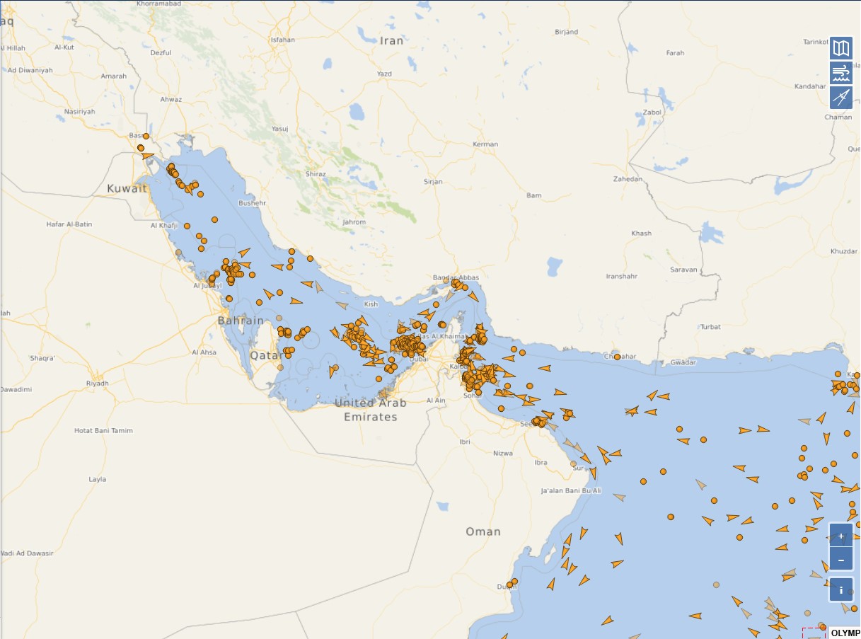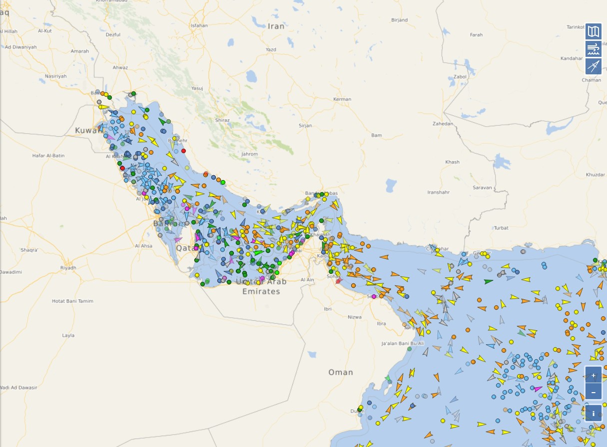 A juzgar por las imágenes que ademas no representan el 100 % de los barcos en la region, no se parece estar viendo un estrecho minado y/o un paso cerrado ni al comercio ni al petroleo